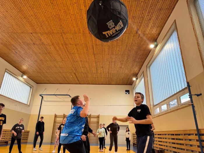 V hodinách TV se objevil nový prvek – obrovský měkký balon. Hra, která se s tímto míčem hraje se nazývá Kin-ball a pochází z Kanady. Jedná se o týmový sport, jehož cílem je odehrát míč tak, aby jej tým na příjmu nechytil a míč se dotkl země. My jsme si pravidla trošičku upravili, aby si zahráli všichni žáci v hodině. Děti si tuto hru velmi oblíbily a děkujeme panu Matušíkovi za tento dar.