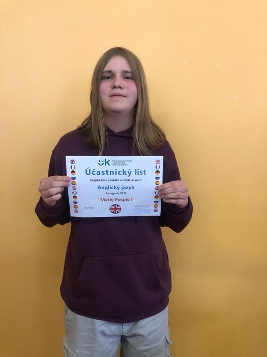 Žák naší školy Matěj Pospíšil byl velmi úspěšný v krajském kole olympiády z Aj. Sklidil sice bramborovou medaili, ale se ztrátou nízkého počtu bodů. Moc gratulujeme a děkujeme za vzornou reprezentaci.
