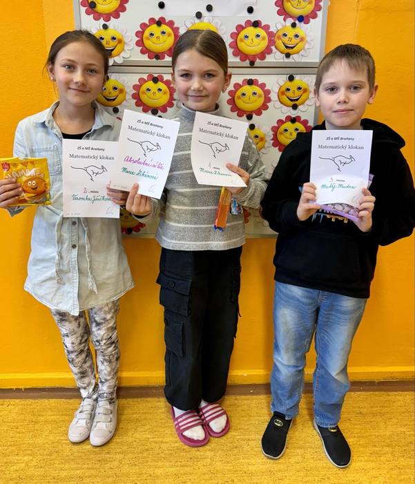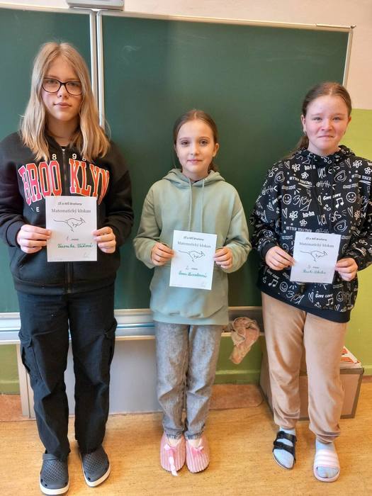 V pátek 22. 3. 2024 proběhla na naší škole mezinárodní matematická soutěž Matematický klokan. Úlohy jsou uspořádány podle obtížnosti a testuje se matematické myšlení a logika. Žáci byli rozděleni do kategorií: Cvrček – 2. - 3. třída Klokánek – 4. - 5. třída Benjamin – 6. - 7. třída Kadet – 8. - 9. třída Všem našim soutěžícím náleží pochvala za úspěšné zvládnutí této soutěže.