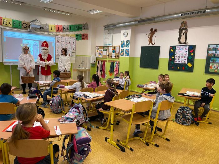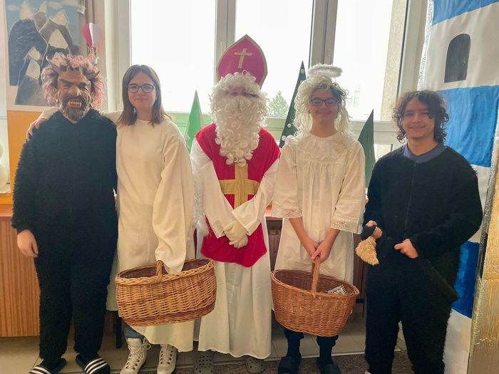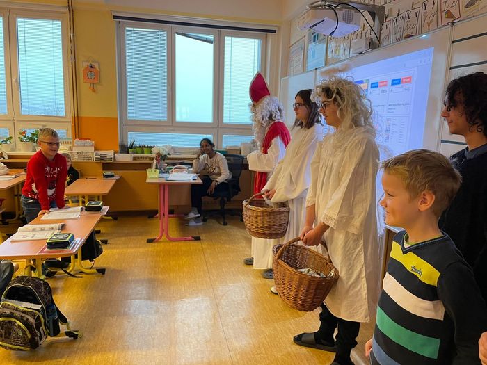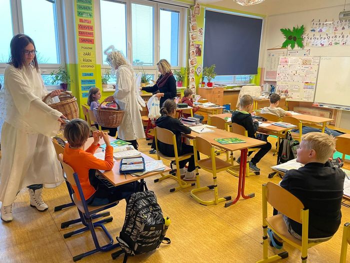 Tak se dočkali. Po roce naši školu navštívili Mikuláš, Andělé i Čerti. Někteří „zlobivci“ málem skončili v pekle, ale kamarádi ze třídy je vykoupili písničkou. Vše dobře dopadlo, sladkosti v bříšku a kalendář na nový rok si odnášejí všichni.