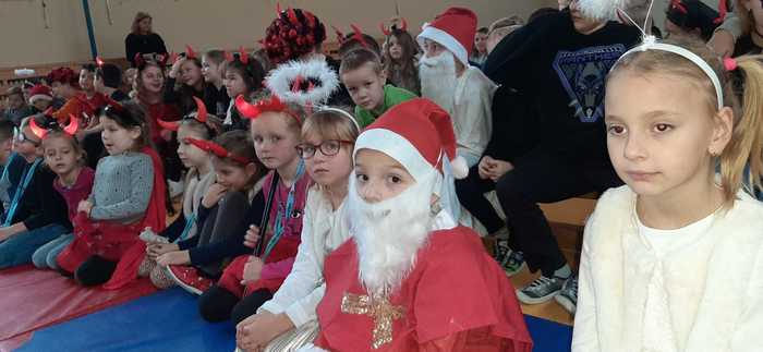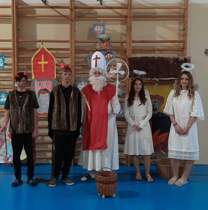 Dneska přišel za dětmi Mikuláš. Přivedl s sebou i anděly a čerty. Ve škole jsou jen hodné děti, a tak byli čerti bez práce. Všichni Mikulášovi zazpívali nebo zarecitovali a dostali sladkou odměnu. Role Mikuláše, čertů i andělů sehráli žáci 9. ročníku. Moc jim děkujeme. Akce se v předvánoční atmosféře vydařila. Dnes domů nikdo neodchází s prázdnou – všichni žáci obdrželi kalendář na nový rok, který opět pro školu nechaly vyrobit SD.